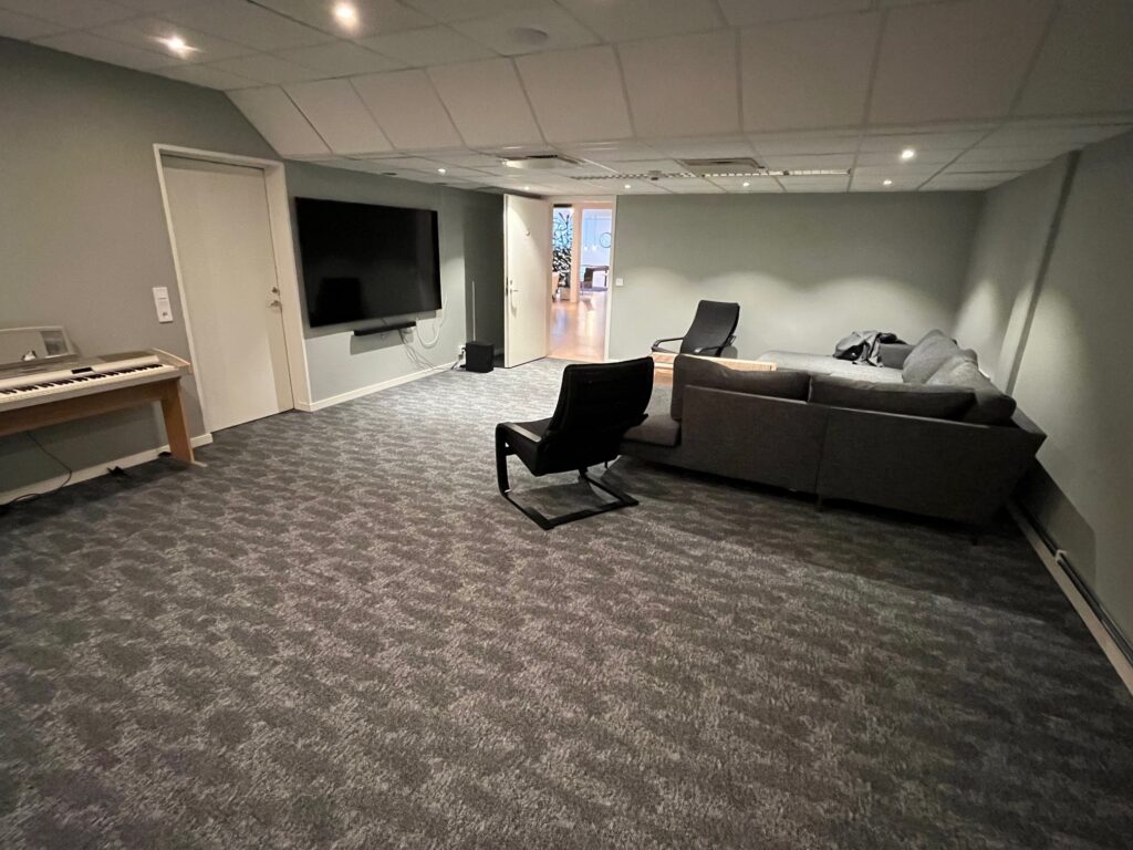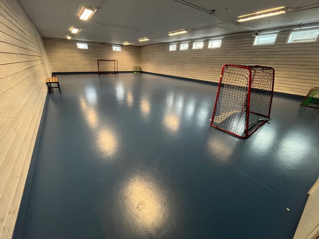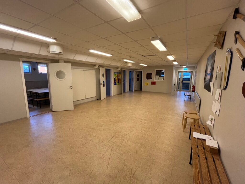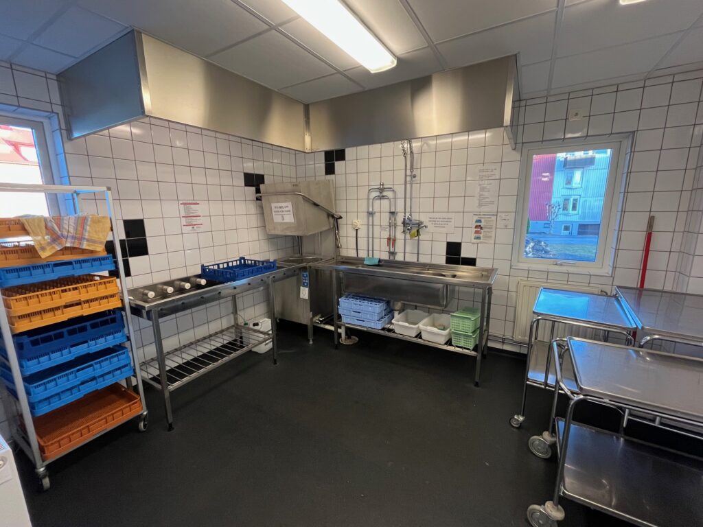 Diskmaskin för storkök finns. Det finns en mindre sporthall (rörelserummet)